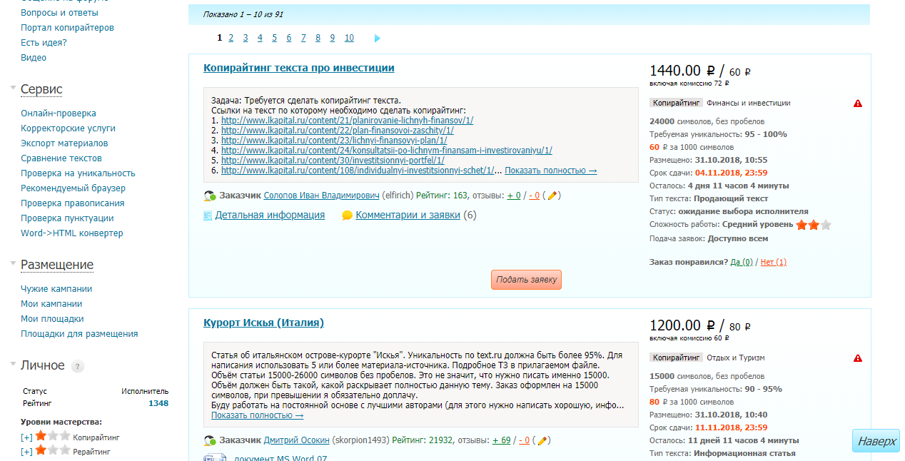 - Text.ru – популярный сервис для копирайтеров с большим выбором заказов