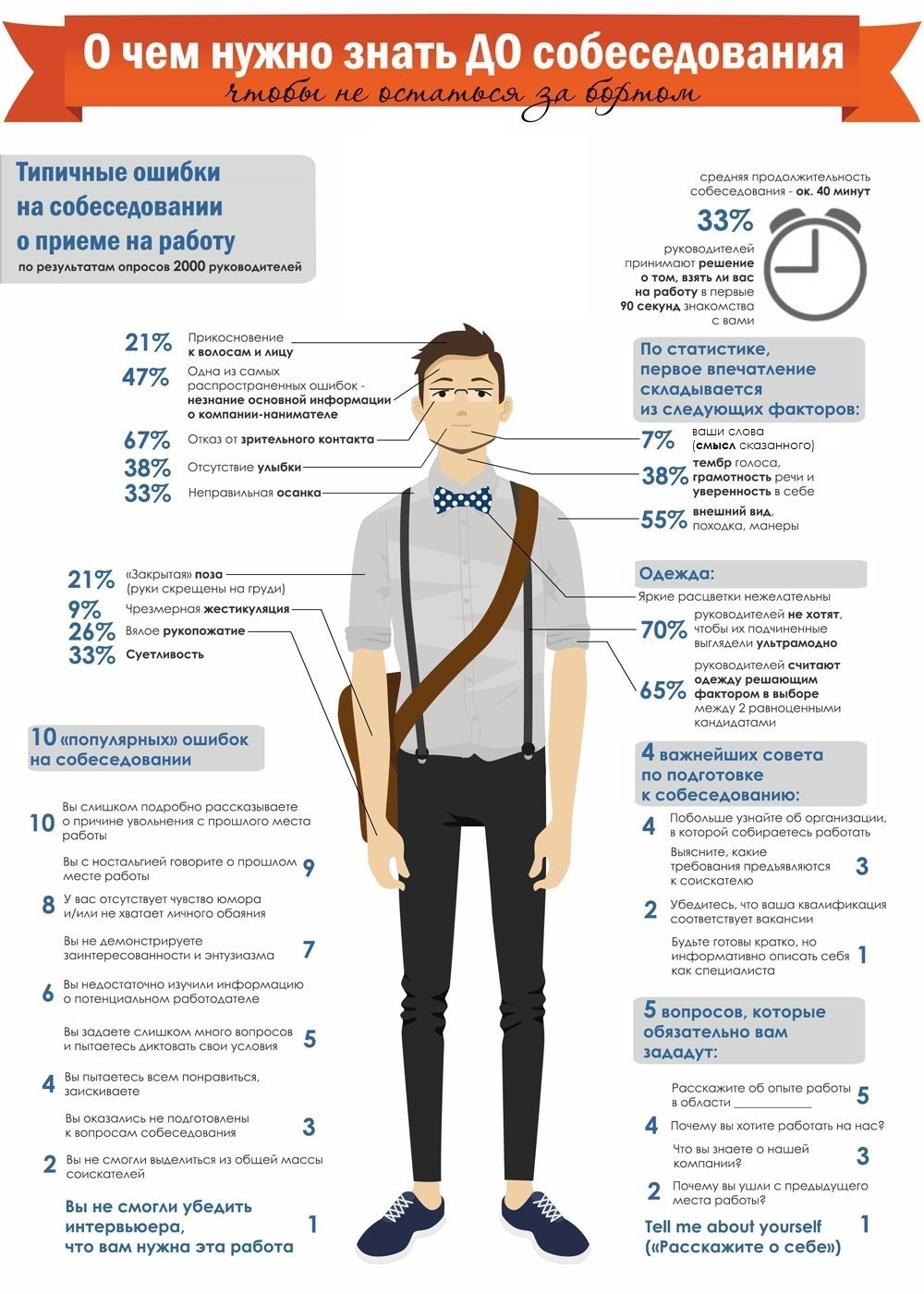 Во многих компаниях для сотрудников установлен строгий дресс-код. Беспроигрышным вариантом станет деловой костюм, за исключением специальностей, когда такая форма одежды неуместна (грузчики, заведующие складом, кассиры и пр.). Женщинам стоит забыть о коротких топах и откровенных облегающих нарядах или мини-юбках. Для мужчин под запретом кроссовки и спортивные костюмы. Одежда должна быть опрятной и чистой. Наряд перед собеседованием лучше примерить дома: не смотритесь ли вы в нем нелепо?