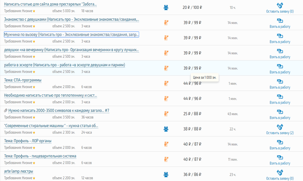 Тестирования на грамотность нет, можно сразу приступать к поиску заказов. Минимальная расценка – 30 руб. за 1000 зн., специалисты с опытом берут за работу 40-60 руб. за 1000 зн.