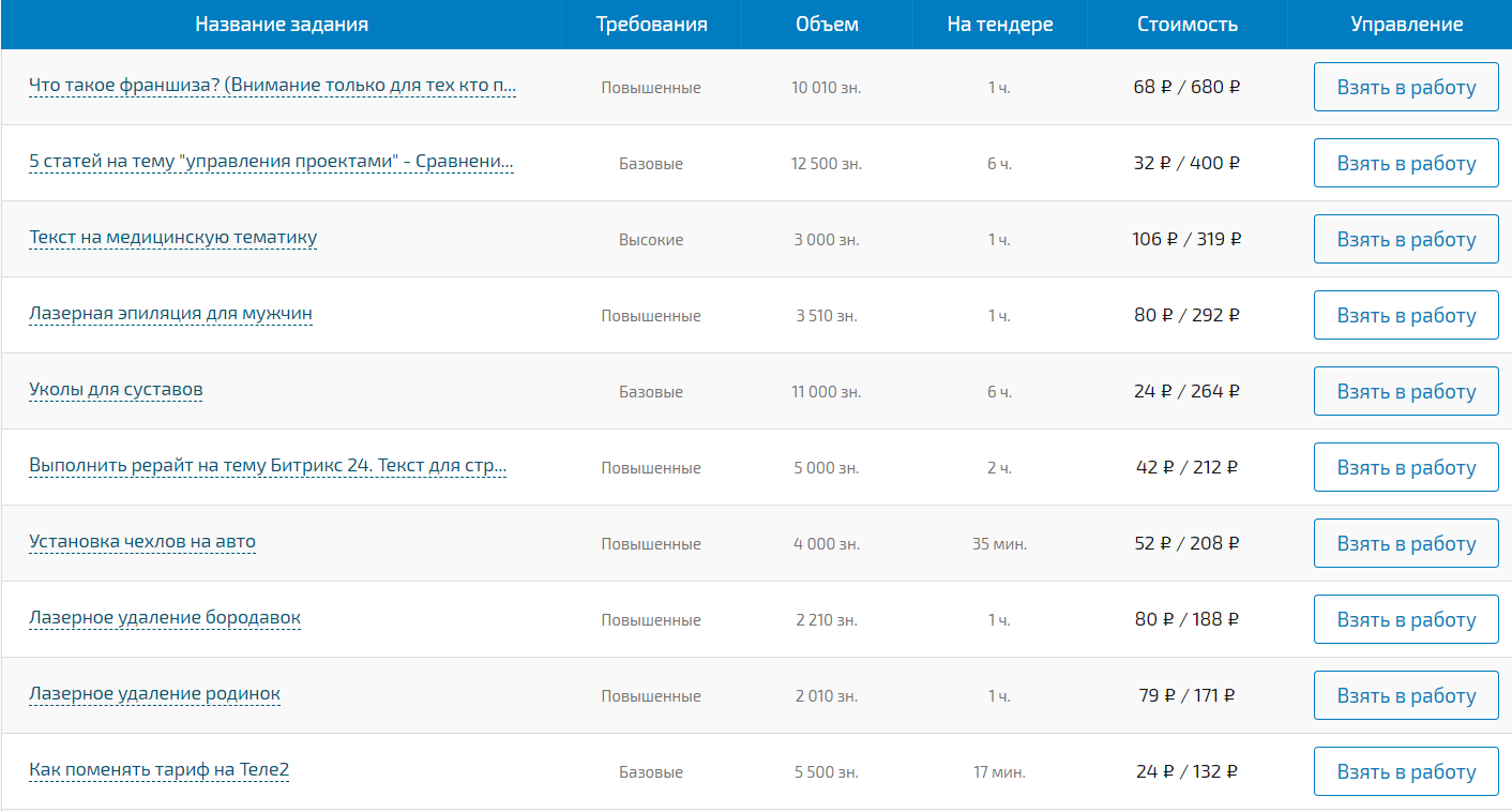 Доступ к заданиям по рерайтингу и копирайтингу имеют только те исполнители, которые получили за сочинение оценку 4-5 баллов. Еще один плюс биржи – не приходится конкурировать с другими исполнителями, на базовом уровне достаточно нажать кнопку «Принять» и заказ поступает в работу.